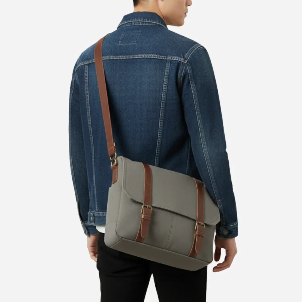 The Classic Commuter Messenger is the perfect fusion of heritage design and modern function. The heavy-duty canvas material is treated for water resistance, ensuring your documents and devices stay dry. The classic double-strap closure, featuring thick, rich brown leather and robust brass buckles, provides both security and a distinguished, vintage aesthetic that looks better the more you use it.