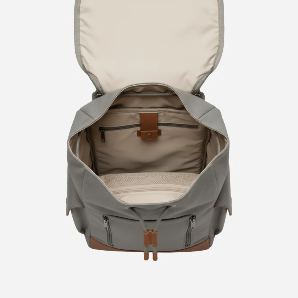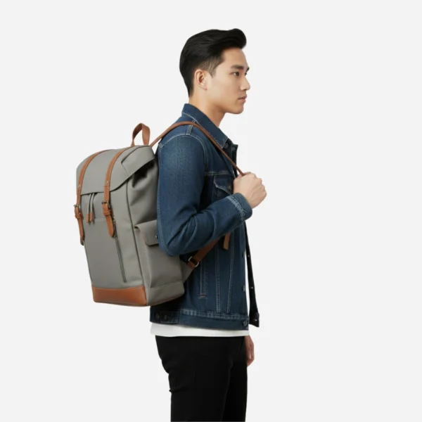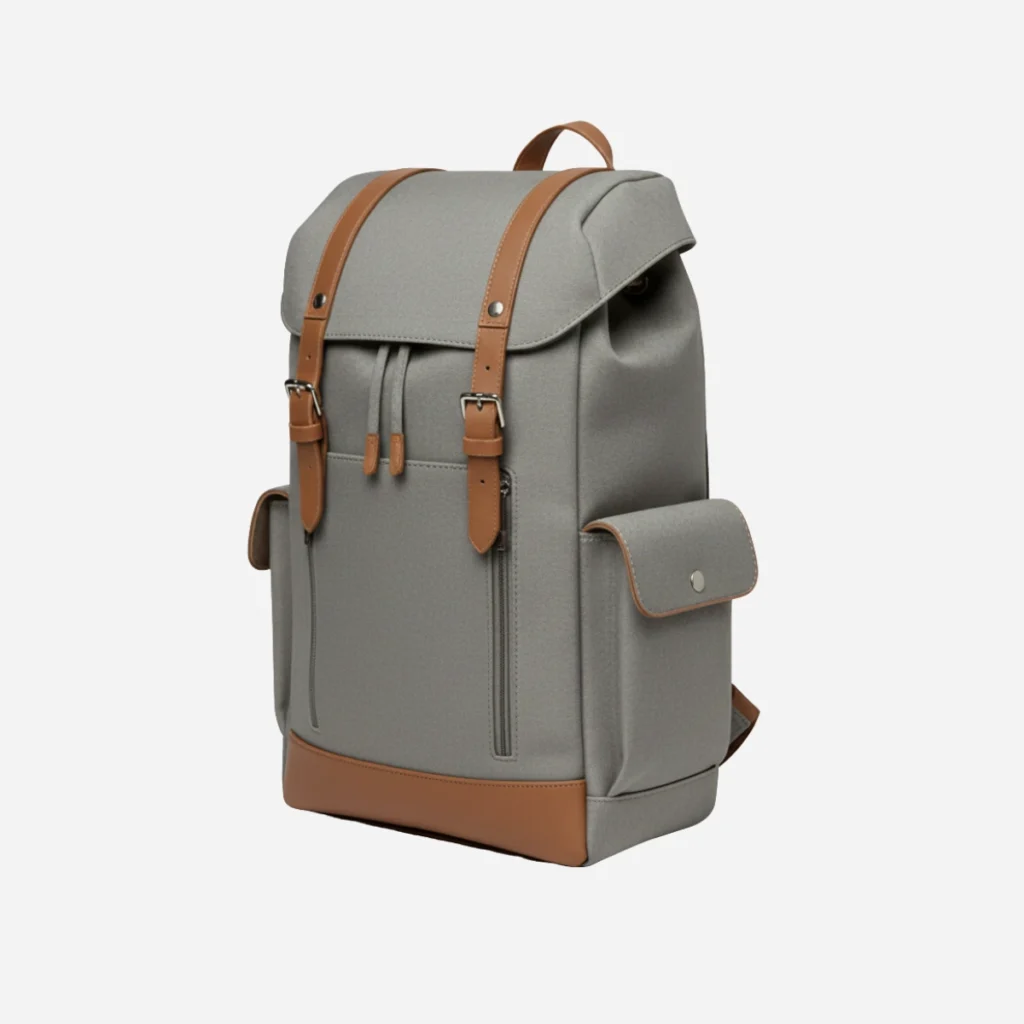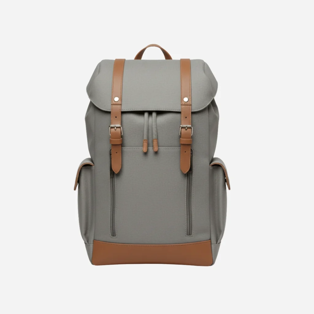 A light-gray canvas rucksack with tan leather accents, brass hardware, a drawstring main compartment, and side pockets—perfect for light travel, campus life, or adding a rugged classic touch to your daily carry.