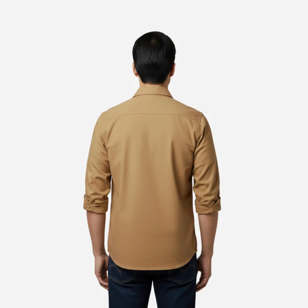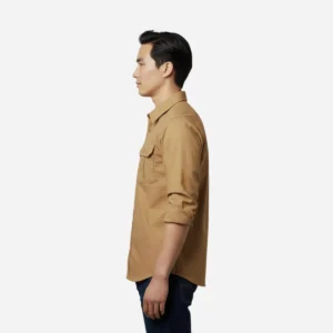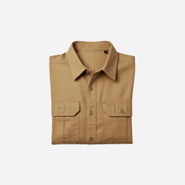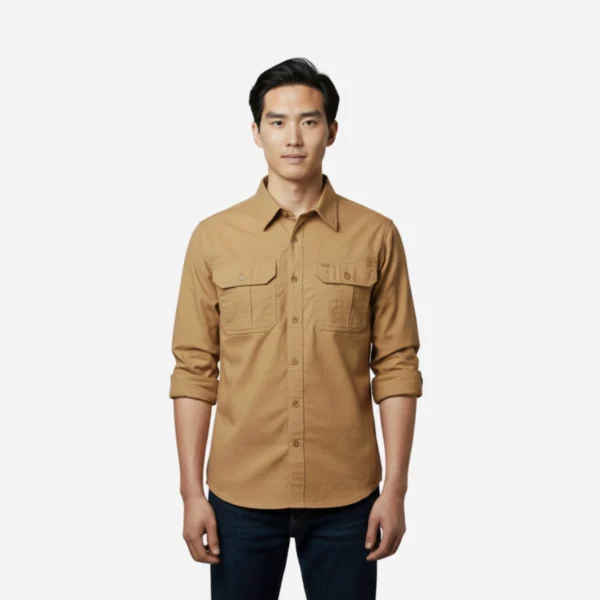 A mid-weight cotton twill shirt in classic tan with dual flap pockets—perfect as a functional overshirt or a casual everyday button-down.