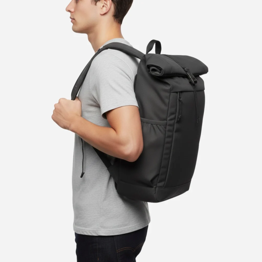 The Urban Commuter is built to handle the unexpected. Its sleek, black/dark gray exterior is made from durable, tightly woven, weatherproof fabric that protects your valuables from rain and splashes. The signature roll-top design expands when you need extra room and cinches down securely with a heavy-duty clip, ensuring a compact profile when traveling light.